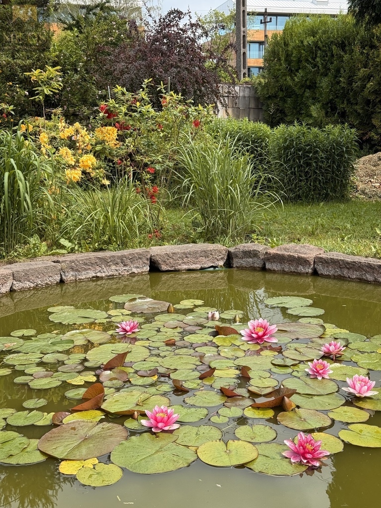 Oczko wodne oraz drzewa owocowe: czereśnia, brzoskwinia.